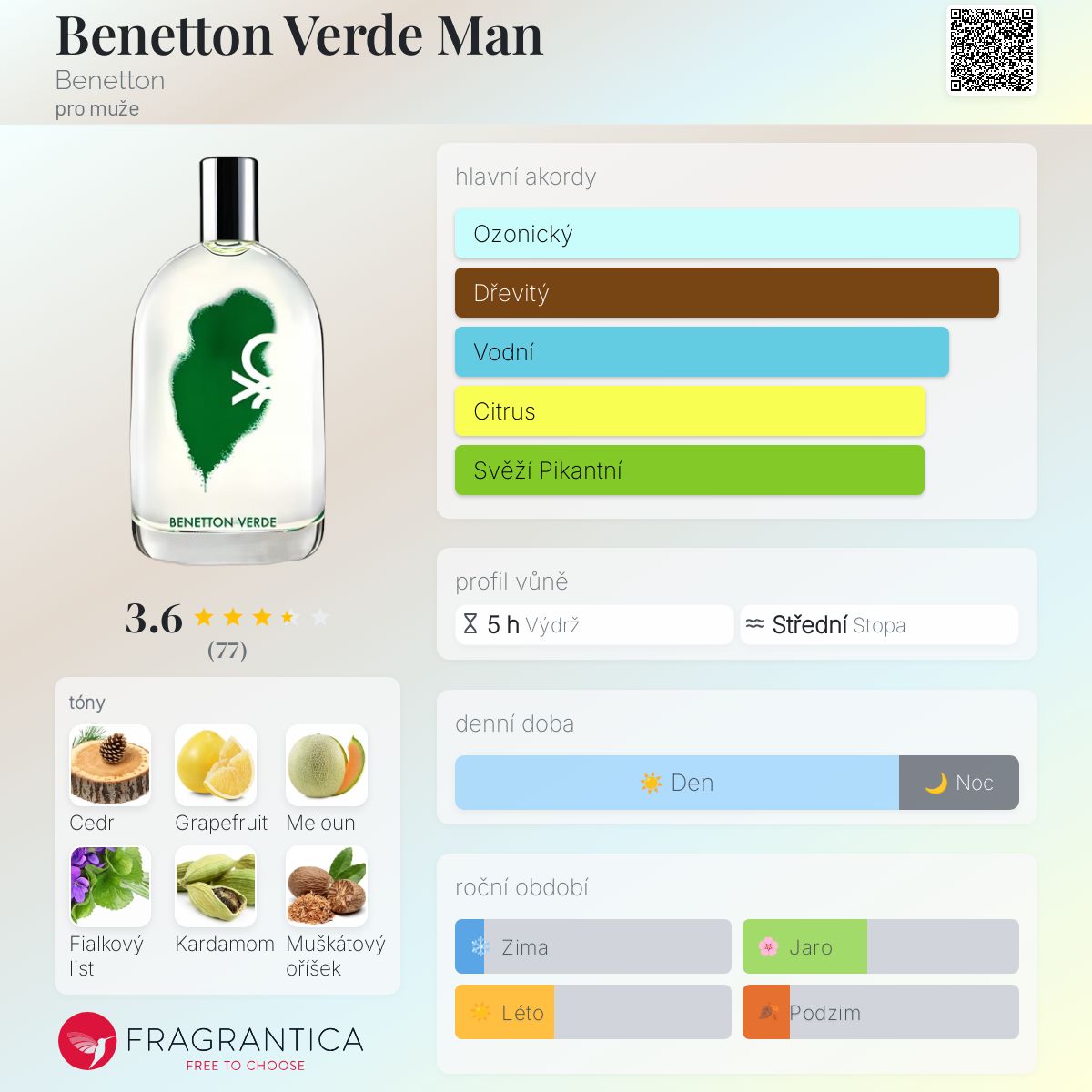 Benetton Verde Man podle Benetton je Woody Aromatic vůně pro muže. Benetton Verde Man byl/a uveden/a v roce 2010. Vrchní tóny jsou Grapefruit, Meloun a Kardamom; střední tóny jsouFialkový list, Muškátový oříšek a Pelargónie ; základní tóny jsou Virginský cedr, Benzoin a Guajakové dřevo.