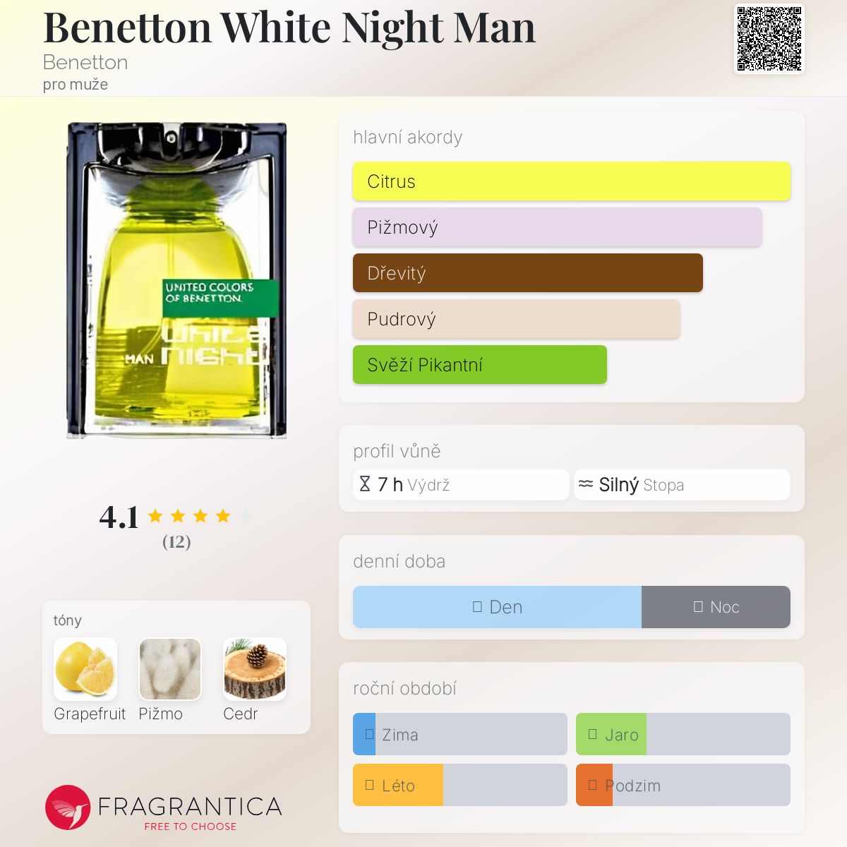 Benetton White Night Man podle Benetton je Aromatic vůně pro muže. Benetton White Night Man byl/a uveden/a v roce 2008. Vrchní tón je Grapefruit ; základní tóny jsou Bílé pižmo a Cedr.