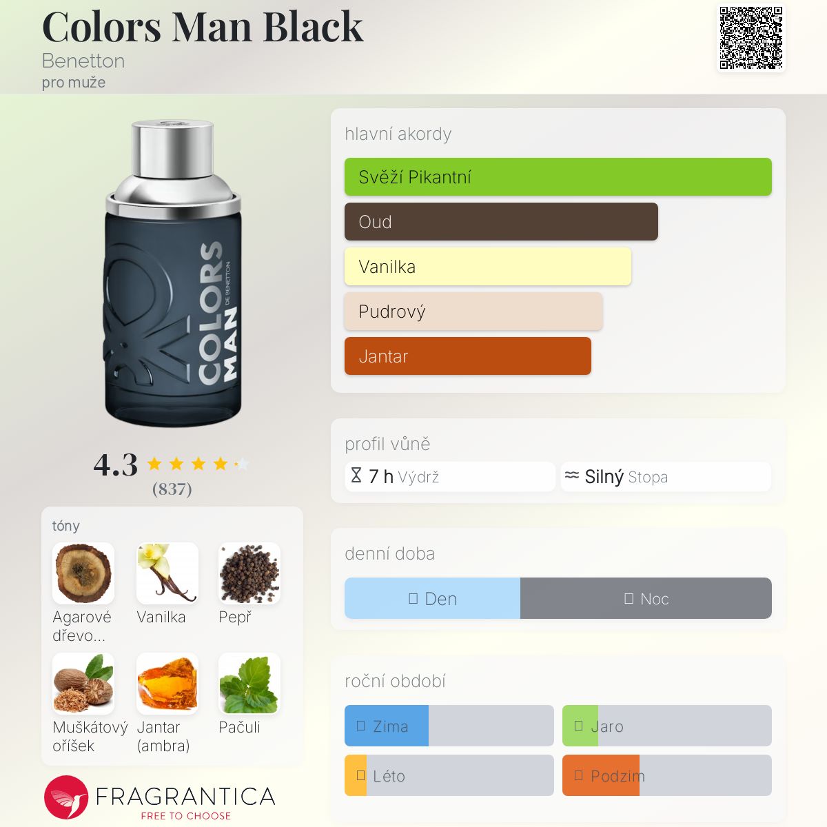 Colors Man Black podle Benetton je Orientální Woody vůně pro muže. Colors Man Black byl/a uveden/a v roce 2019. Vrchní tóny jsou Černý pepř, Muškátový oříšek a Bergamot; střední tóny jsouPačuli, Levandule, Vetiver a Semiš ; základní tóny jsou Agarové dřevo (oud), Vanilka, Jantar (ambra) a Pižmo.