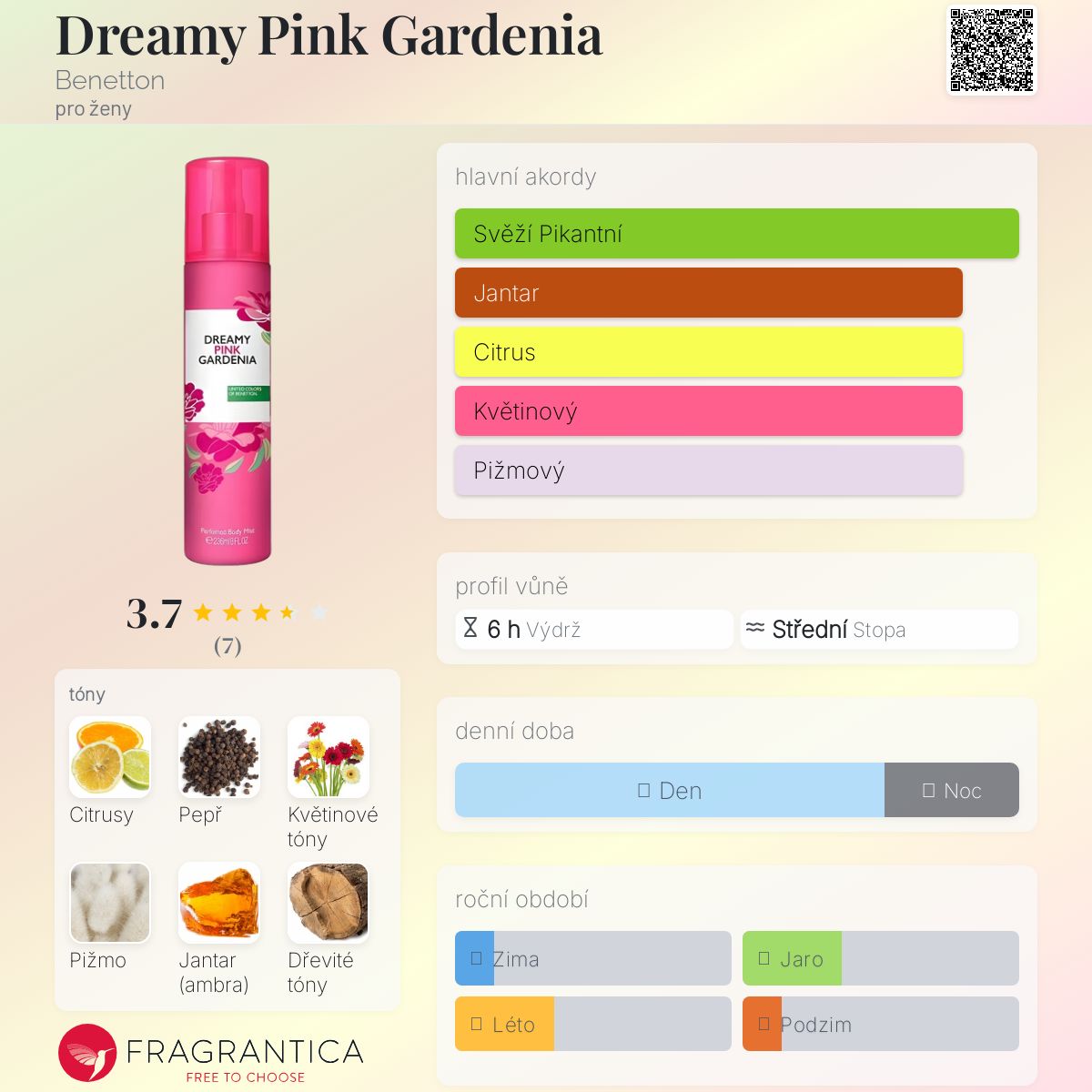 Dreamy Pink Gardenia podle Benetton je Chypre vůně pro ženy. Dreamy Pink Gardenia byl/a uveden/a v roce 2020. Vrchní tóny jsou Citrusy a Pepř; střední tón jeKvětinové tóny ; základní tóny jsou Pižmo, Jantar (ambra) a Dřevité tóny.