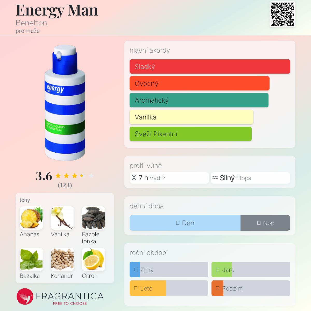 Energy Man podle Benetton je Aromatic Fruity vůně pro muže. Energy Man byl/a uveden/a v roce 2008. Vrchní tóny jsou Ananas, Bazalka, Citrón a Anýz; střední tóny jsouFazole tonka, Koriandr, Levandule a Pepř ; základní tóny jsou Vanilka, Pačuli a Cedr.