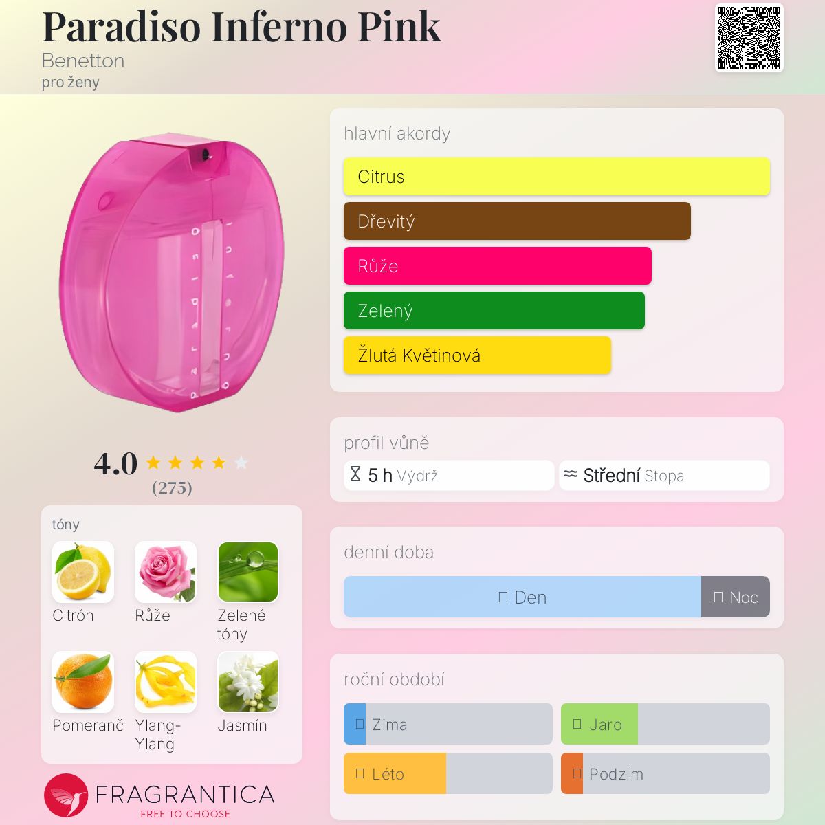 Paradiso Inferno Pink podle Benetton je Floral vůně pro ženy. Paradiso Inferno Pink byl/a uveden/a v roce 2004. Vrchní tóny jsou Citrón, Zelené listí a Pomeranč; střední tóny jsouRůže, Ylang-Ylang a Jasmín ; základní tóny jsou Cedr, Pižmo a Santalové dřevo.