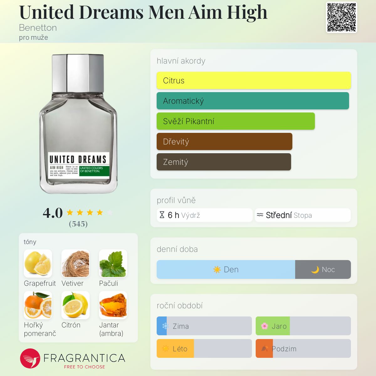 United Dreams Men Aim High podle Benetton je Woody Aromatic vůně pro muže. United Dreams Men Aim High byl/a uveden/a v roce 2015. Vrchní tóny jsou Grapefruit, Hořký pomeranč a Citrón; střední tóny jsouMáta, Šalvěj, Pelargónie a Muškátový oříšek ; základní tóny jsou Vetiver, Pačuli, Jantar (ambra) a Mech.