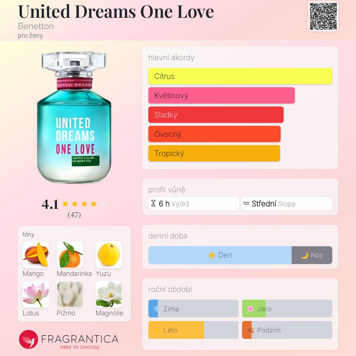 United Dreams One Love podle Benetton je Floral Fruity vůně pro ženy. United Dreams One Love byl/a uveden/a v roce 2017. Vrchní tóny jsou Mango, Mandarinka a Yuzu; střední tóny jsouLotus a Magnólie ; základní tóny jsou Pižmo a Vanilka.
