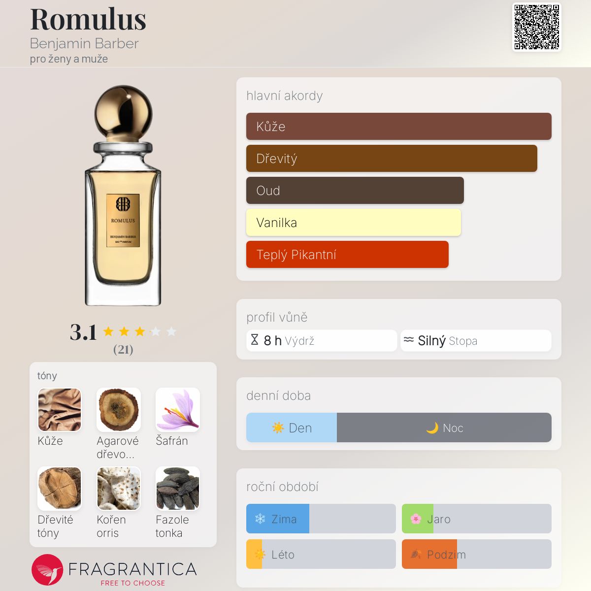 Romulus podle Benjamin Barber je Leather vůně pro ženy a muže. Toto je nová vůně. Romulus byl/a uveden/a v roce 2025. "Nosem" za touto vůní je Mathieu Nardin. Vrchní tóny jsou Kůže, Šafrán a Skořice; střední tóny jsouOrris, Lorenox a Otočník ; základní tóny jsou Agarové dřevo (oud), Dřevité tóny, Fazole tonka, Vanilka a Cypriolový olej.