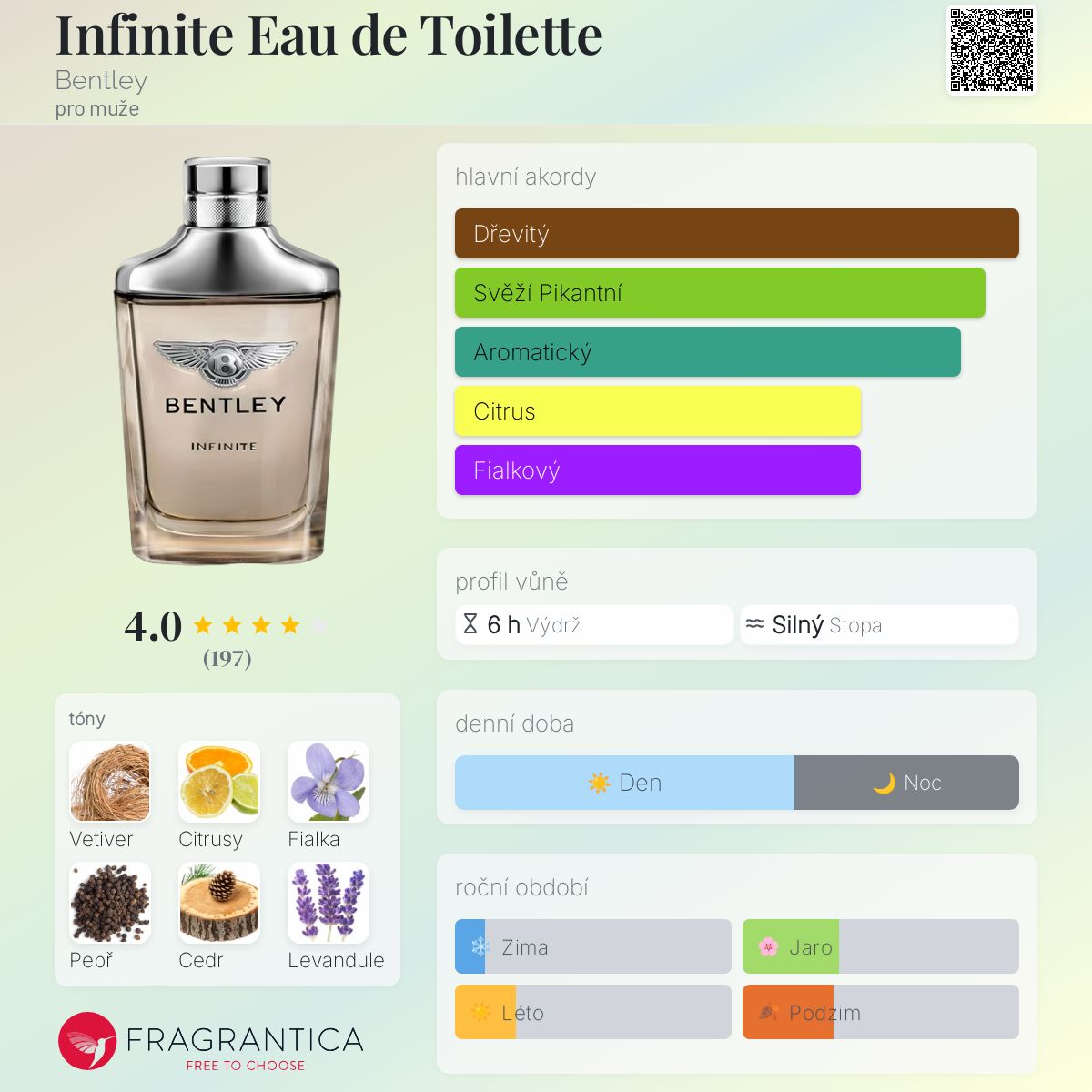Infinite Eau de Toilette podle Bentley je Woody Aromatic vůně pro muže. Infinite Eau de Toilette byl/a uveden/a v roce 2015. "Nosem" za touto vůní je Nathalie Lorson. Vrchní tóny jsou Citrusy, Cedr a Levandule; střední tóny jsouFialka, Bourbonský pepř a Pelargónie ; základní tóny jsou Haitský vetiver, Ambra a Pačuli.