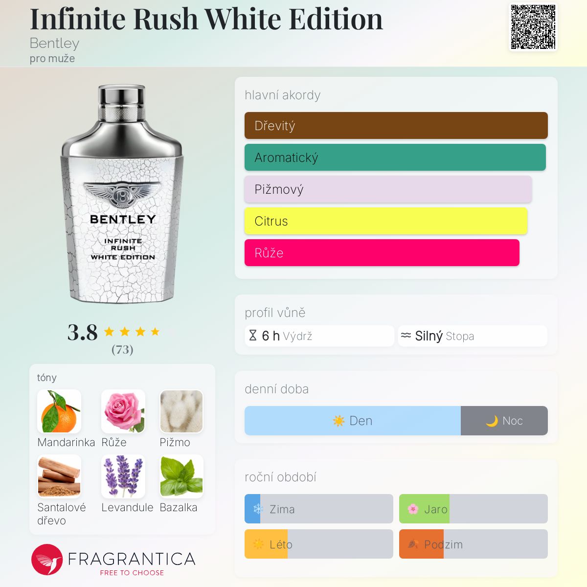 Infinite Rush White Edition podle Bentley je Aromatic vůně pro muže. Infinite Rush White Edition byl/a uveden/a v roce 2016. "Nosem" za touto vůní je Karine Dubreuil-Sereni. Vrchní tóny jsou Italská mandarinka a Levandule; střední tóny jsouTurecká růže, Bazalka a Tymián ; základní tóny jsou Bílé pižmo, Santalové dřevo a Kašmírové dřevo.
