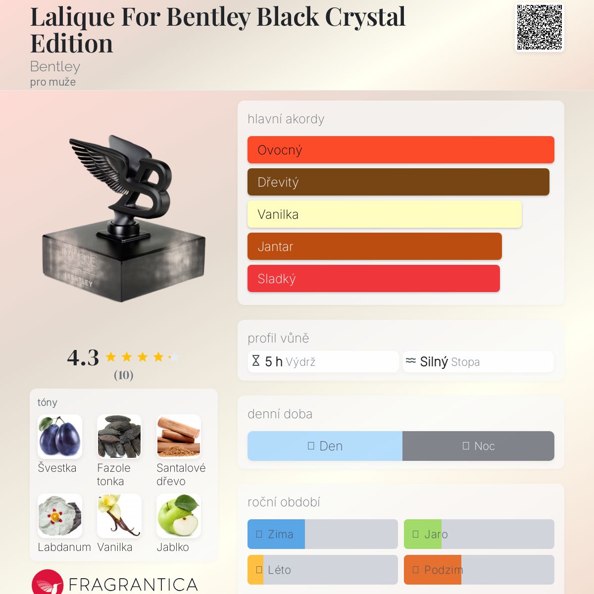 Lalique For Bentley Black Crystal Edition podle Bentley je Orientální Woody vůně pro muže. Lalique For Bentley Black Crystal Edition byl/a uveden/a v roce 2017. "Nosem" za touto vůní je Dorothée Piot. Vrchní tóny jsou Jablko a Bergamot; střední tóny jsouŠvestka, Růže, Atlasový cedr a Papyrus ; základní tóny jsou Fazole tonka, Santalové dřevo, Labdanum, Vanilka, Kůže, Pačuli a Virginský cedr.