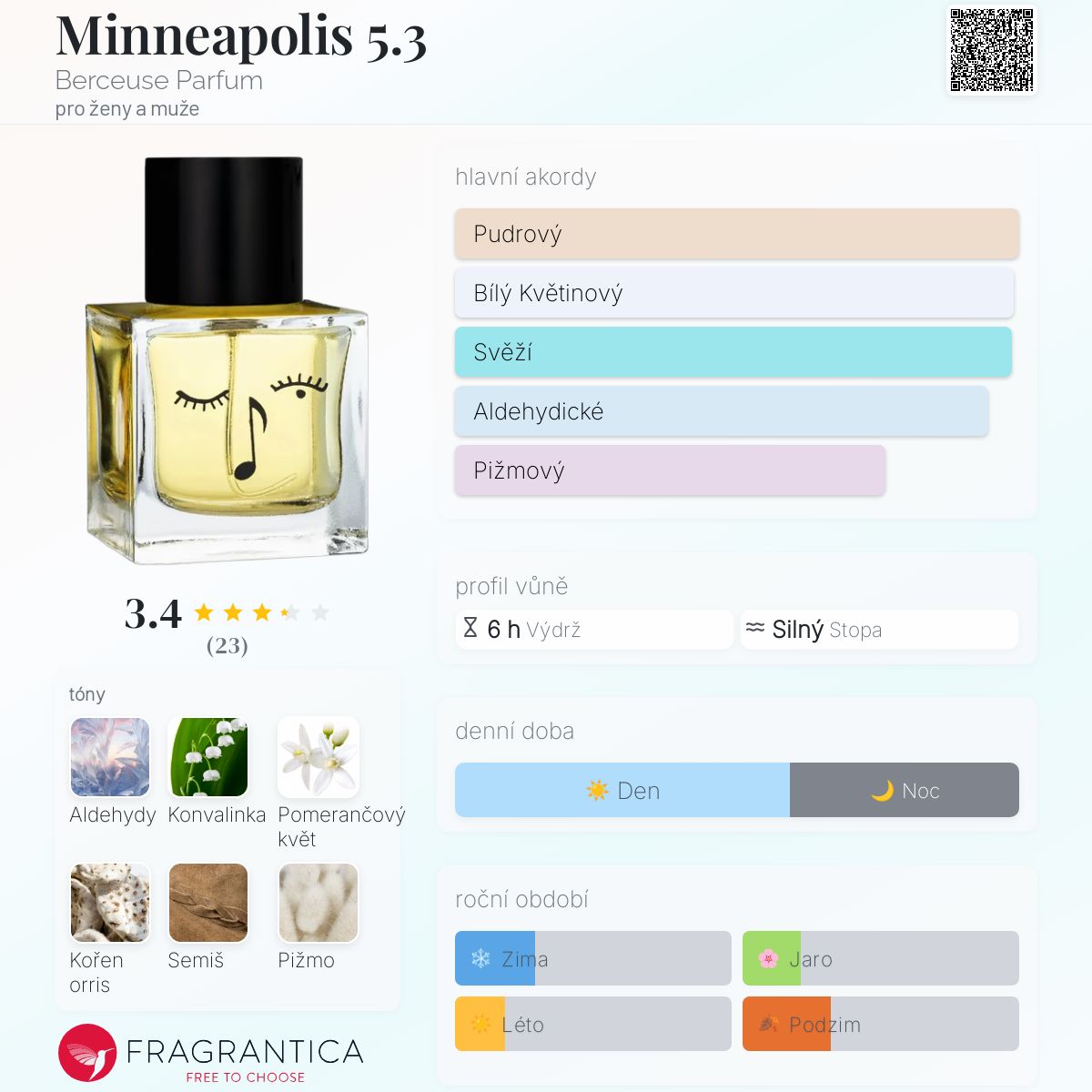 Minneapolis 5.3 podle Berceuse Parfum je vůně pro ženy a muže. Minneapolis 5.3 byl/a uveden/a v roce 2022. "Nosem" za touto vůní je Spyros Drosopoulos. Vrchní tóny jsou Aldehydy, Citrusy, Hřebíček a Skořice; střední tóny jsouKonvalinka, Pomerančový květ, Kořen kosatce, Ylang-Ylang a Růže ; základní tóny jsou Semiš, Pižmo, Pudrové tóny, Pačuli, Santalové dřevo, Dubový mech a Jantar (ambra).