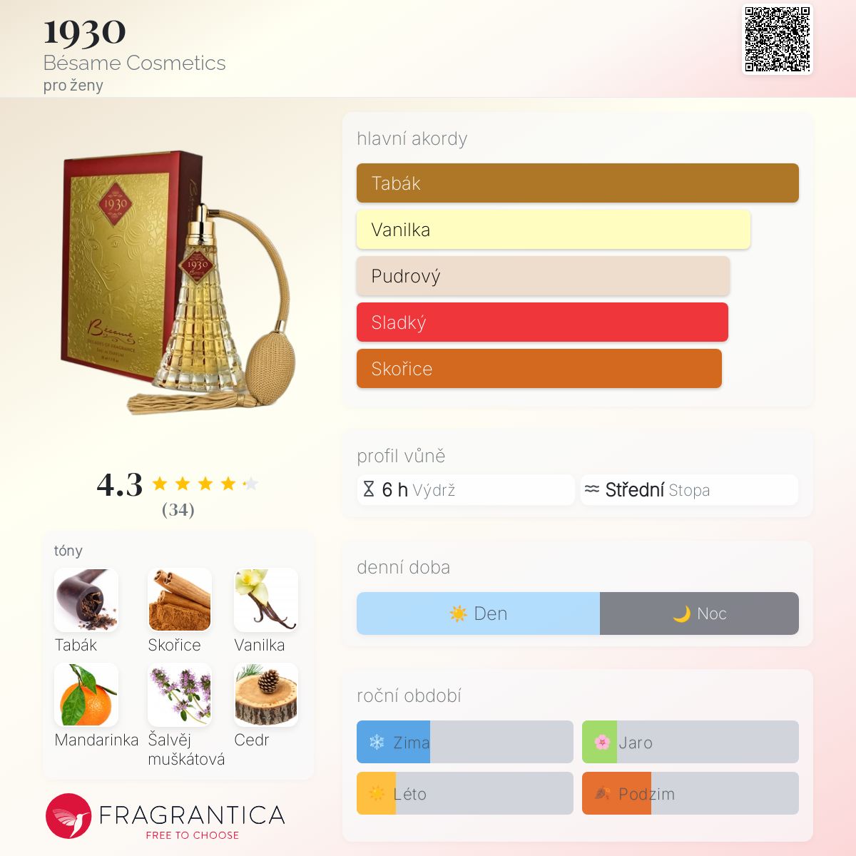 1930 podle Bésame Cosmetics je Orientální vůně pro ženy. 1930 byl/a uveden/a v roce 2014. "Nosem" za touto vůní je Gabriela Hernandez. Vrchní tóny jsou Skořice, Mandarinka a Šalvěj muškátová; střední tóny jsouTabák, Levandule a Otočník ; základní tóny jsou Vanilka, Cedr a Pižmo.