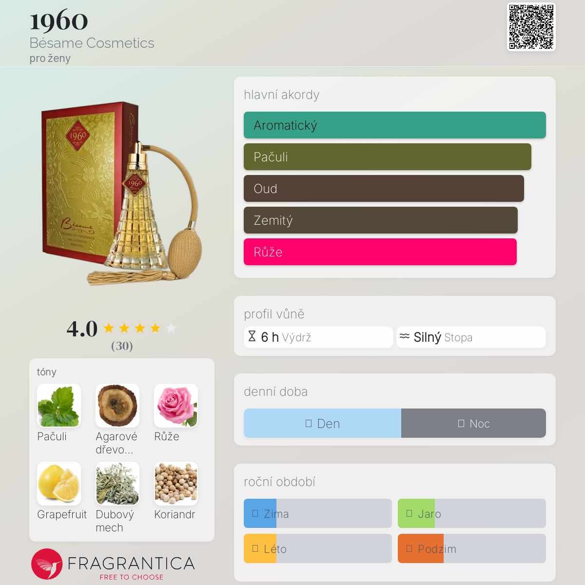1960 podle Bésame Cosmetics je Chypre Floral vůně pro ženy. 1960 byl/a uveden/a v roce 2014. "Nosem" za touto vůní je Gabriela Hernandez. Vrchní tóny jsou Grapefruit, Koriandr a Pelyněk; střední tóny jsouRůže, Jasmín a Rýt ; základní tóny jsou Pačuli, Agarové dřevo (oud) a Dubový mech.