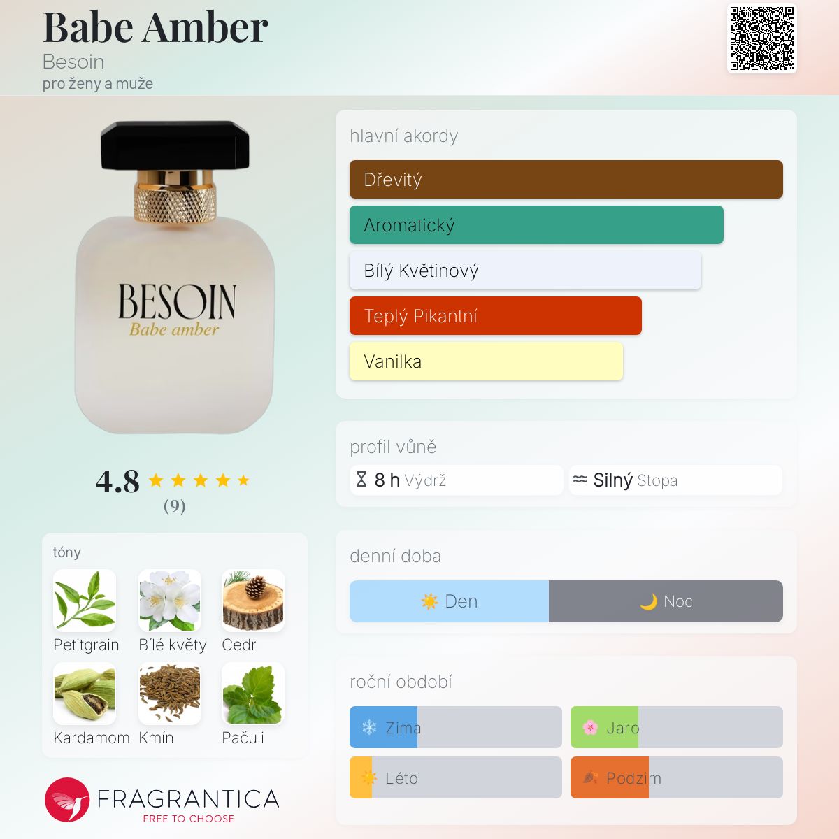 Babe Amber podle Besoin je Orientální vůně pro ženy a muže. Toto je nová vůně. Babe Amber byl/a uveden/a v roce 2024. "Nosem" za touto vůní je Rosa Vaia. Vrchní tóny jsou Petitgrain, Kardamom, Kmín a Růžový pepř; střední tóny jsouBílé květy, Pačuli a Kadidlo ; základní tóny jsou Cedr, Vanilka, Benzoin, Vetiver a Jantar (ambra).