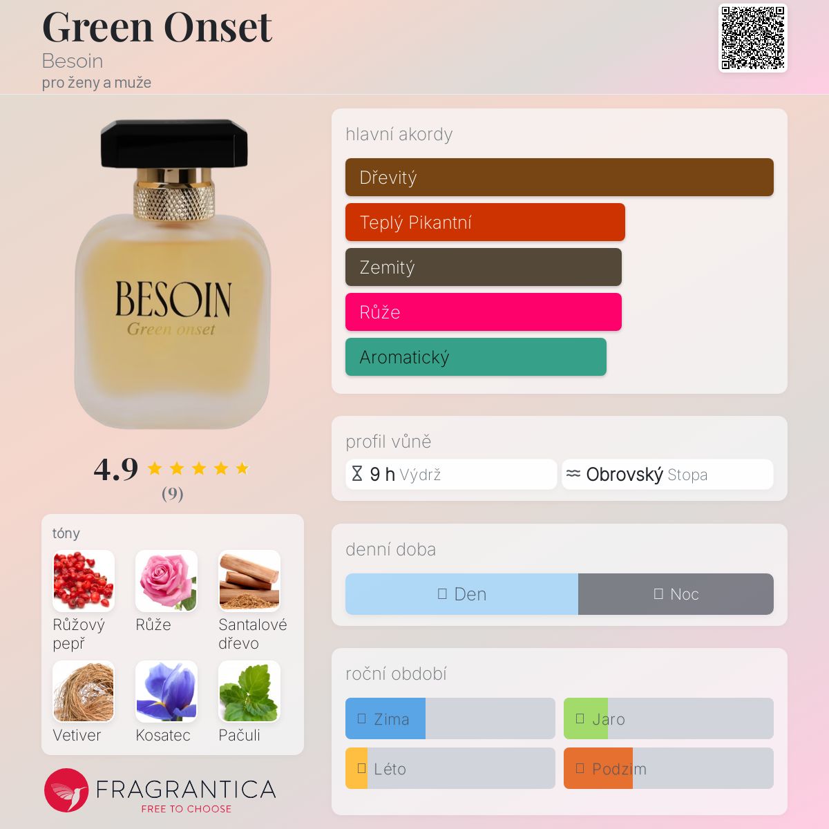 Green Onset podle Besoin je Orientální Fougere vůně pro ženy a muže. Toto je nová vůně. Green Onset byl/a uveden/a v roce 2024. "Nosem" za touto vůní je Rosa Vaia. Vrchní tóny jsou Růžový pepř, Kosatec, Kardamom a Máta; střední tóny jsouRůže, Pačuli, Kadidlo a Zelený čaj ; základní tóny jsou Santalové dřevo, Vetiver, Ambrocenide, Kůže a Balzám Tolu.