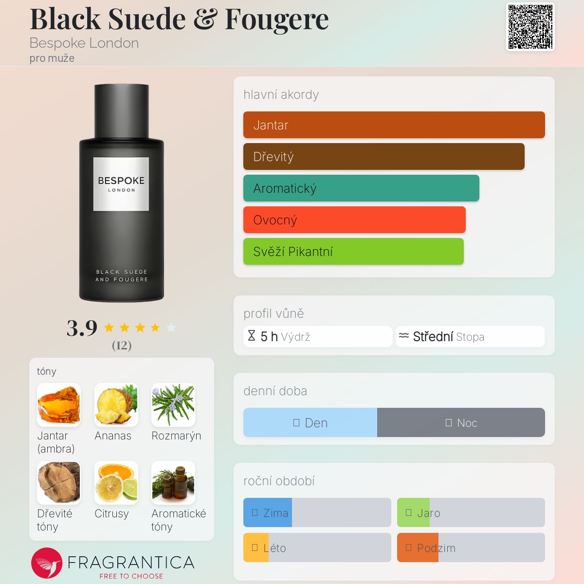 Black Suede & Fougere podle Bespoke London je Citrus Aromatic vůně pro muže. Toto je nová vůně. Black Suede & Fougere byl/a uveden/a v roce 2024. Vrchní tóny jsou Ananas a Citrusy; střední tóny jsouRozmarýn, Aromatické tóny a Fougere akord ; základní tóny jsou Jantar (ambra), Dřevité tóny a Labdanum.