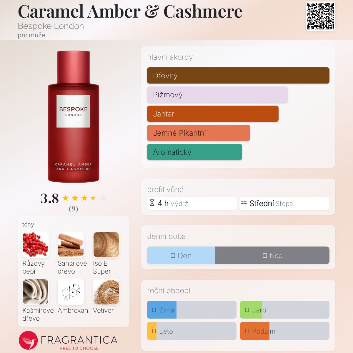 Caramel Amber & Cashmere podle Bespoke London je Woody Spicy vůně pro muže. Toto je nová vůně. Caramel Amber & Cashmere byl/a uveden/a v roce 2024. Vrchní tóny jsou Růžový pepř a Černý pepř; střední tóny jsouIso E Super a Ambroxan ; základní tóny jsou Santalové dřevo, Kašmírové dřevo a Vetiver.