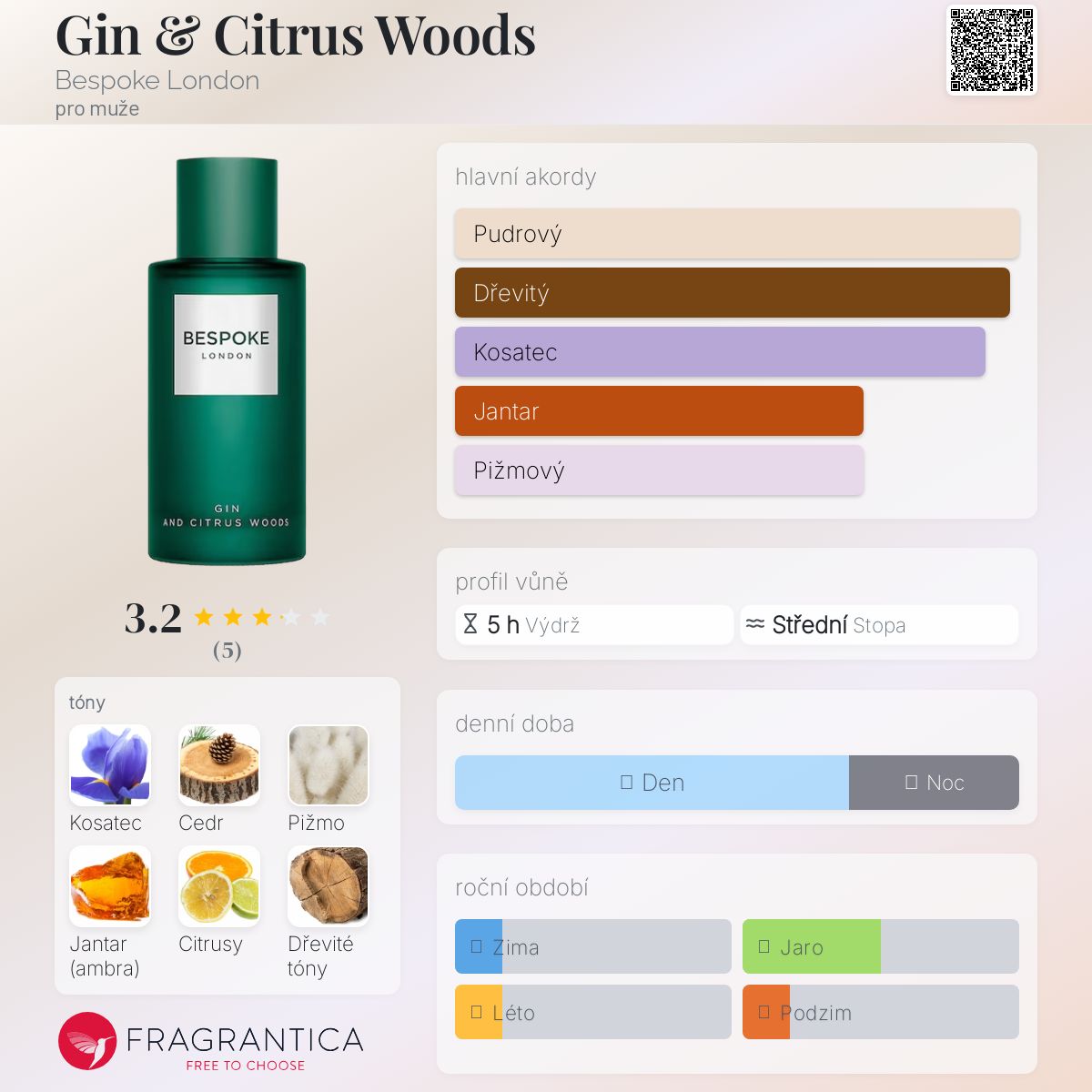 Gin & Citrus Woods podle Bespoke London je Woody Aromatic vůně pro muže. Toto je nová vůně. Gin & Citrus Woods byl/a uveden/a v roce 2024. Vrchní tóny jsou Citrusy, Gin a Galbanum; střední tóny jsouKosatec, Cedr, Květinové tóny, Santalové dřevo a Dubový mech ; základní tóny jsou Kašmírové pižmo, Jantar (ambra) a Dřevité tóny.