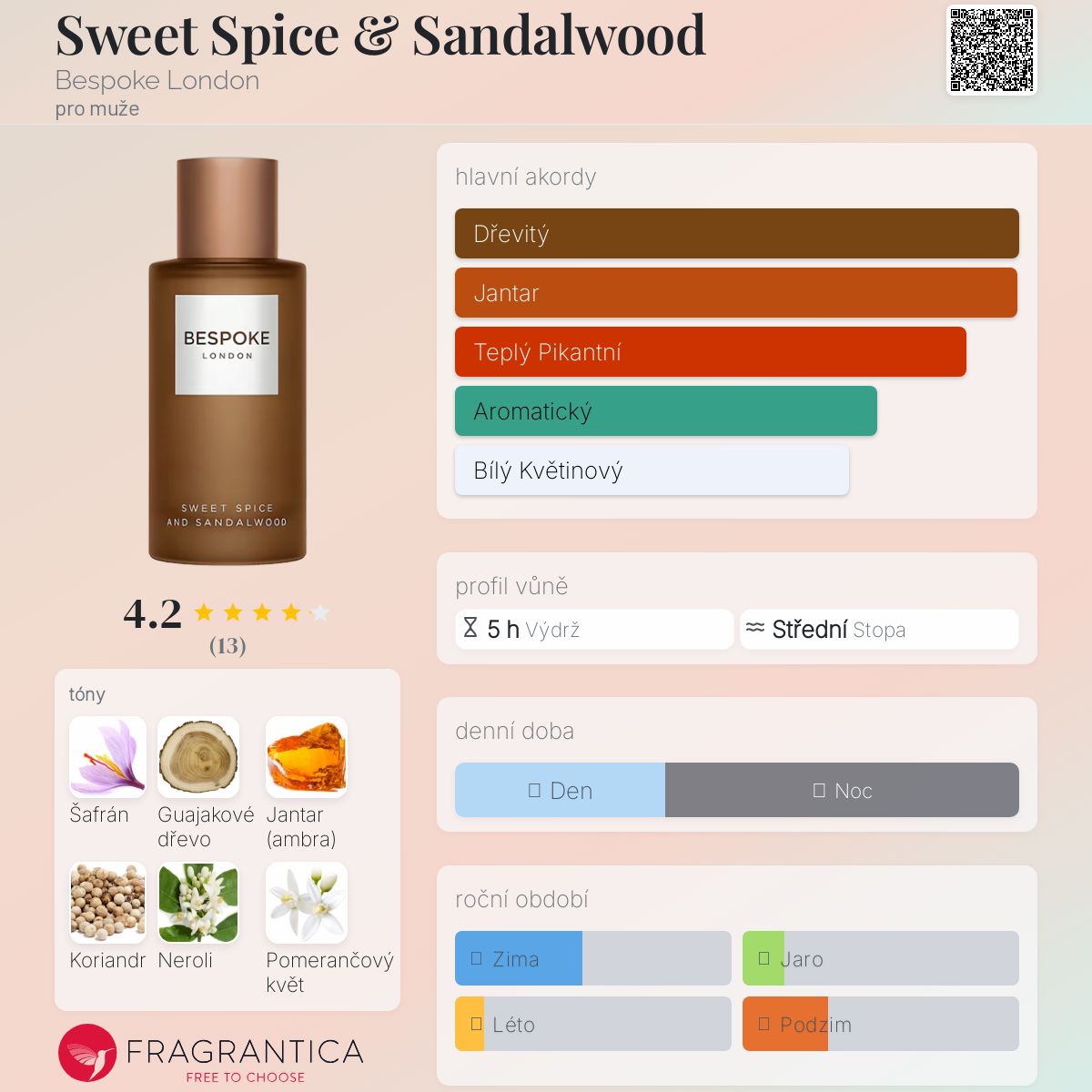 Sweet Spice & Sandalwood podle Bespoke London je Orientální Spicy vůně pro muže. Toto je nová vůně. Sweet Spice & Sandalwood byl/a uveden/a v roce 2024. Vrchní tóny jsou Šafrán, Koriandr, Neroli, Bergamot a Muškátový oříšek; střední tóny jsouPomerančový květ, Jasmín, Růže a Masticha ; základní tóny jsou Guajakové dřevo, Jantar (ambra), Vanilka, Santalové dřevo, Cedr, Labdanum a Citrusy.