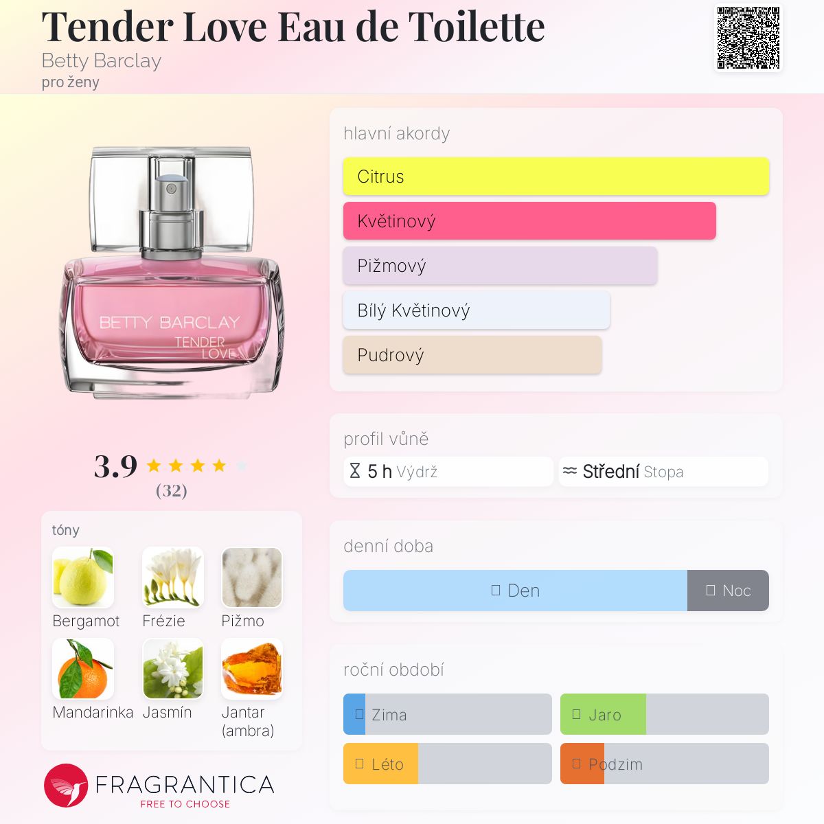 Tender Love Eau de Toilette podle Betty Barclay je Floral Fruity vůně pro ženy. Tender Love Eau de Toilette byl/a uveden/a v roce 2020. Vrchní tóny jsou Bergamot a Mandarinka; střední tóny jsouFrézie a Jasmín ; základní tóny jsou Pižmo a Jantar (ambra).