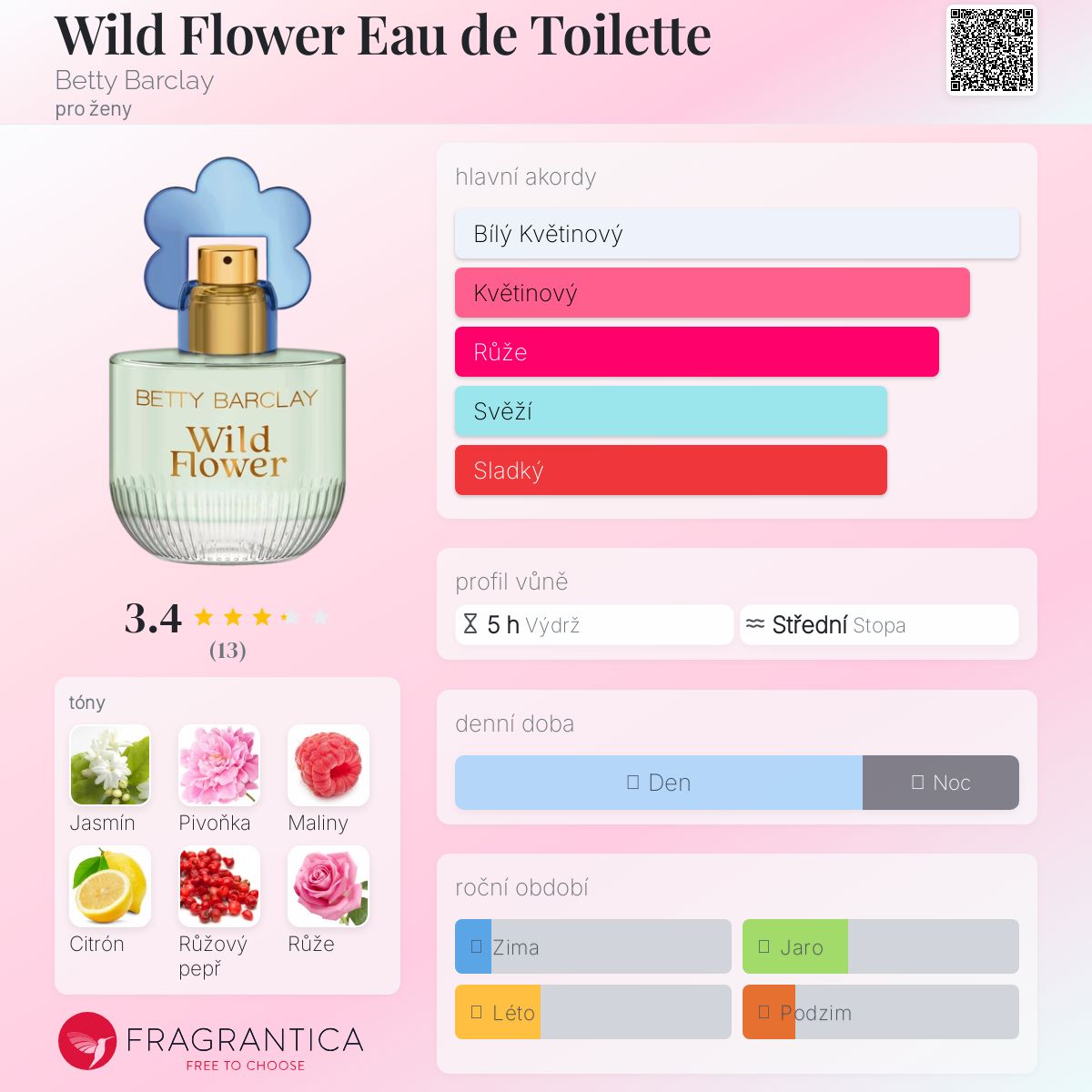 Wild Flower Eau de Toilette podle Betty Barclay je Floral Fruity vůně pro ženy. Wild Flower Eau de Toilette byl/a uveden/a v roce 2022. Vrchní tóny jsou Maliny, Citrón a Růžový pepř; střední tóny jsouJasmín, Pivoňka a Růže ; základní tóny jsou Fazole tonka, Cedr a Vanilka.