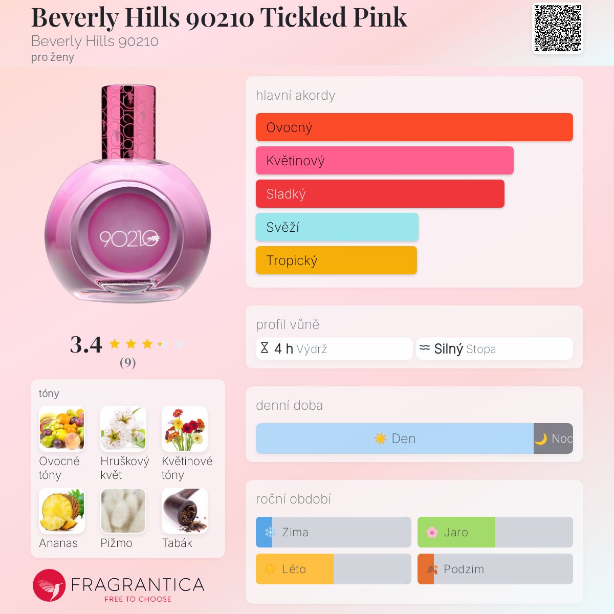 Beverly Hills 90210 Tickled Pink podle Beverly Hills 90210 je Floral Fruity vůně pro ženy. Vrchní tóny jsou Ovocné tóny a Ananas; střední tóny jsouHruškový květ a Květinové tóny ; základní tóny jsou Pižmo, Tabák a Kůže.