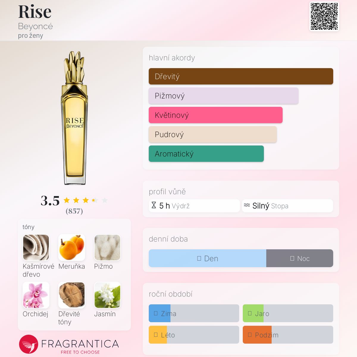 Rise podle Beyoncé je Floral vůně pro ženy. Rise byl/a uveden/a v roce 2014. "Nosem" za touto vůní je Loc Dong. Vrchní tóny jsou Meruňka, Bergamot a Bazalka; střední tóny jsouOrchidej, Jasmín Sambac a Frézie ; základní tóny jsou Kašmírové dřevo, Pižmo, Dřevité tóny a Vetiver.