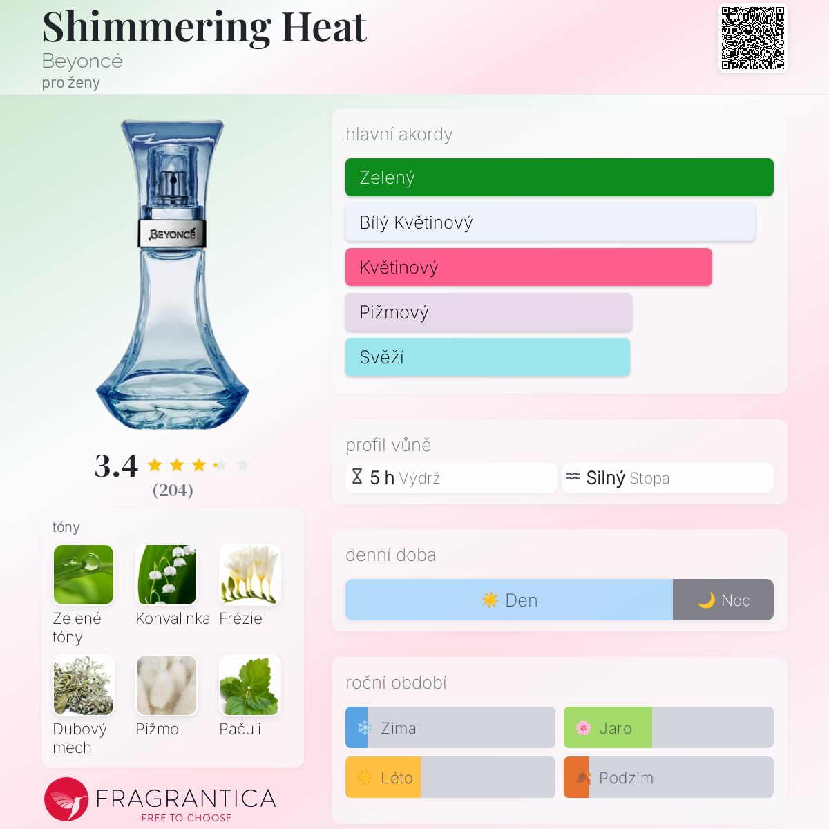 Shimmering Heat podle Beyoncé je Chypre Floral vůně pro ženy. Shimmering Heat byl/a uveden/a v roce 2017. Vrchní tóny jsou Zelené tóny, Frézie a Růžový pepř; střední tóny jsouKonvalinka, Jasmín, Orchidej a Růže ; základní tóny jsou Dubový mech, Pižmo, Pačuli a Vanilka.
