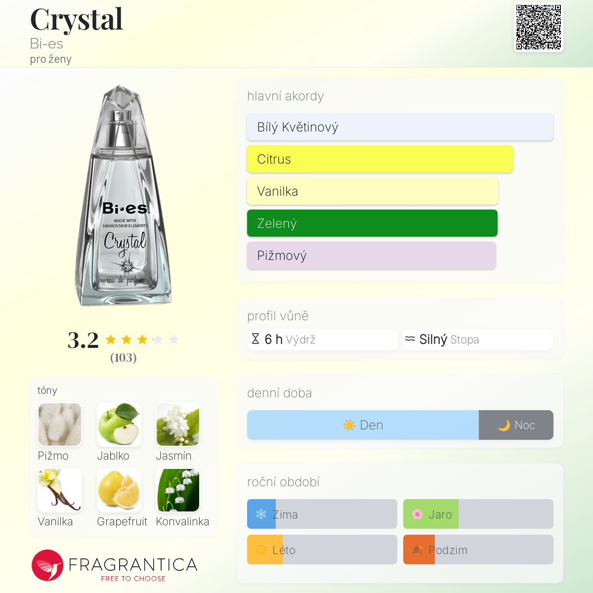 Crystal podle Bi-es je Floral Fruity vůně pro ženy. Vrchní tóny jsou Jablko, Grapefruit, Pomeranč a Galbanum; střední tóny jsouJasmín, Konvalinka a Růže ; základní tóny jsou Pižmo, Vanilka, Jantar (ambra), Cedr a Fazole tonka.