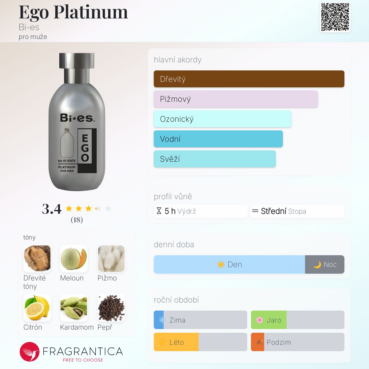 Ego Platinum podle Bi-es je Woody Aromatic vůně pro muže. Vrchní tóny jsou Meloun a Citrón; střední tóny jsouKardamom, Pepř a Zázvor ; základní tóny jsou Dřevité tóny a Pižmo.