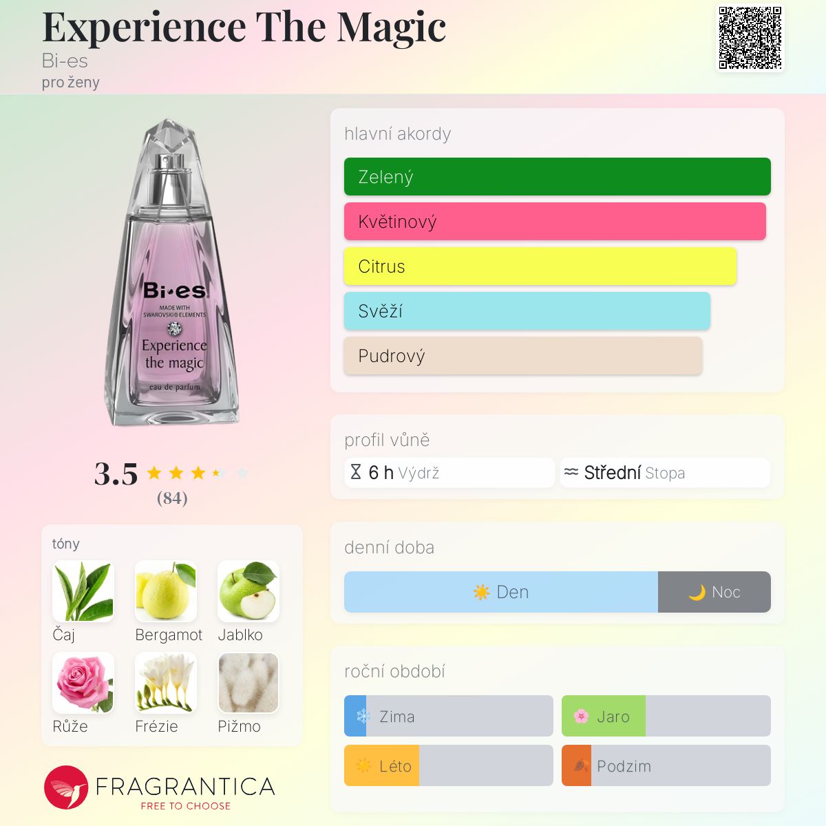 Experience The Magic podle Bi-es je Floral Fruity vůně pro ženy. Vrchní tóny jsou Bílý čaj, Bergamot a Jablko; střední tóny jsouRůže, Frézie a Fialka ; základní tóny jsou Pižmo, Cedr a Jantar (ambra).