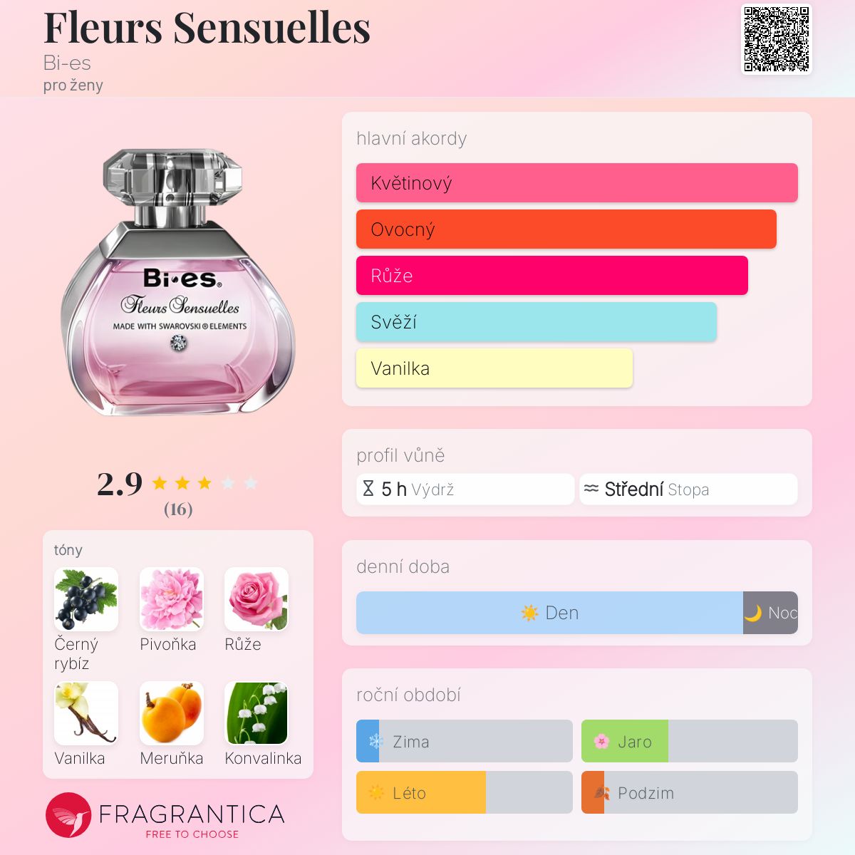 Fleurs Sensuelles podle Bi-es je Orientální Floral vůně pro ženy. Vrchní tóny jsou Černý rybíz, Meruňka a Bergamot; střední tóny jsouPivoňka, Divoká růže a Konvalinka ; základní tóny jsou Vanilkový květ, Bílé dřevo a Pižmo.