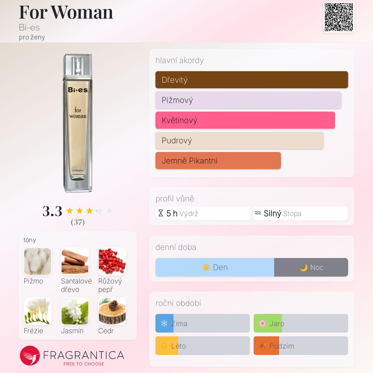 For Woman podle Bi-es je Orientální vůně pro ženy. Vrchní tóny jsou Růžový pepř a Květ jabloně; střední tóny jsouFrézie, Jasmín a Růže ; základní tóny jsou Pižmo, Santalové dřevo a Cedr.