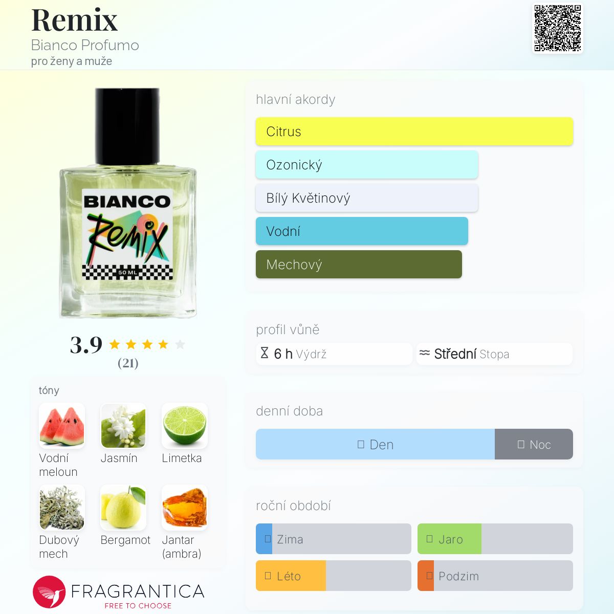 Remix podle Bianco Profumo je vůně pro ženy a muže. Toto je nová vůně. Remix byl/a uveden/a v roce 2024. "Nosem" za touto vůní je Christine Hassan.