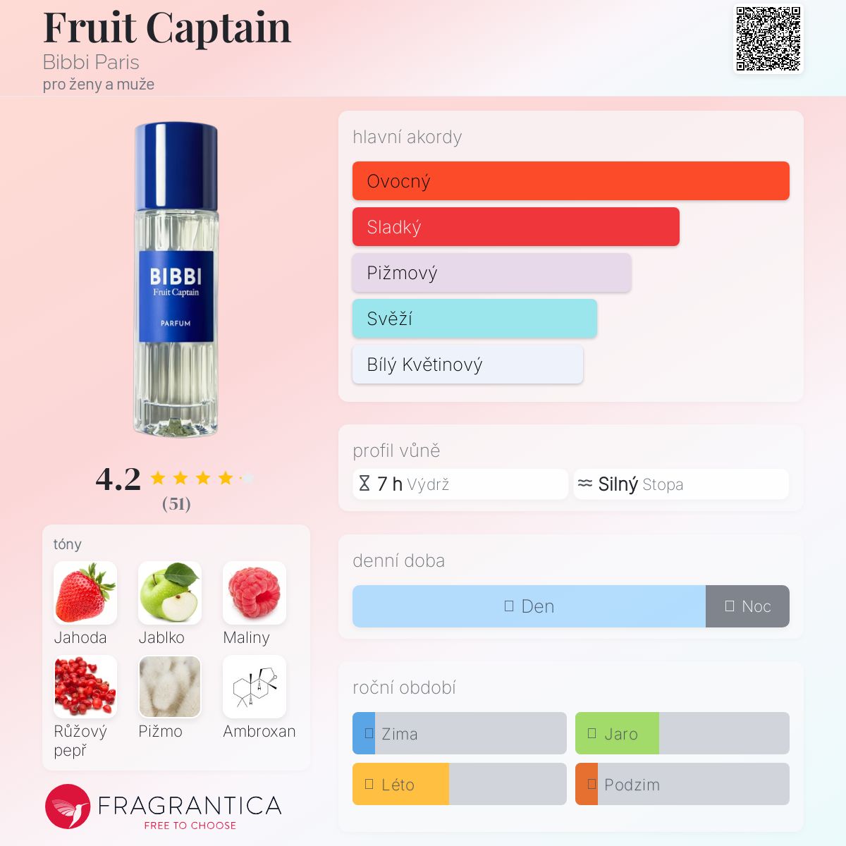 Fruit Captain podle Bibbi Paris je Floral Fruity vůně pro ženy a muže. Toto je nová vůně. Fruit Captain byl/a uveden/a v roce 2024. Vrchní tóny jsou Jahoda, Růžový pepř a Pivoňka; střední tóny jsouZelené jablko, Maliny, Gardénie, Švestka a Jasmín ; základní tóny jsou Pižmo a Ambroxan.