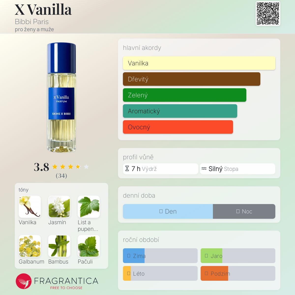 X Vanilla podle Bibbi Paris je vůně pro ženy a muže. Toto je nová vůně. X Vanilla byl/a uveden/a v roce 2024. "Nosem" za touto vůní je Jérôme Epinette. Vrchní tóny jsou Černý rybíz, Švestka a Citrón; střední tóny jsouVanilka, Jasmín Sambac, Galbanum a Bambus ; základní tóny jsou Vanilka, Pačuli a Santalové dřevo.
