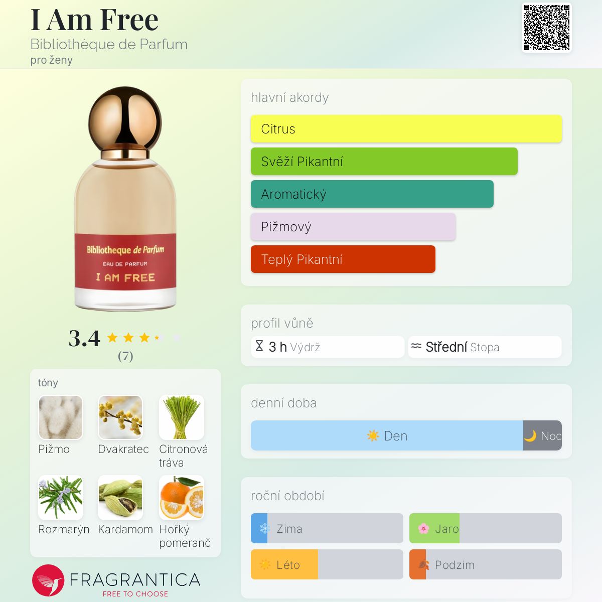 I Am Free podle Bibliothèque de Parfum je Floral Fruity vůně pro ženy. Vrchní tóny jsou Vavřín kubéba, Hořký pomeranč, Grapefruit, Mandarinka a Citrón; střední tóny jsouCitronová tráva, Mořská sůl, Muškátový oříšek, Čaj, Bílé květy a Kokos ; základní tóny jsou Pižmo, Rozmarýn, Kardamom, Ambra a Zázvor.