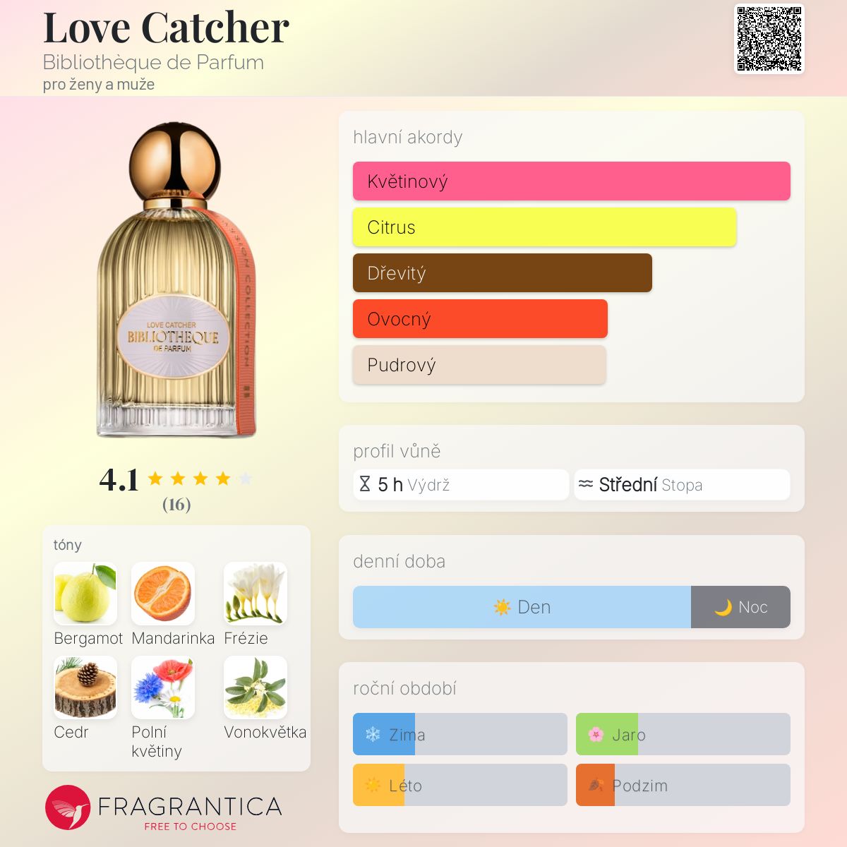 Love Catcher podle Bibliothèque de Parfum je Citrus Aromatic vůně pro ženy a muže. Love Catcher byl/a uveden/a v roce 2019. Vrchní tóny jsou Bergamot, Mandarinka, Magnólie, Koření a Růžový pepř; střední tóny jsouFrézie, Polní květiny, Vonokvětka, Růže a Květ tiare ; základní tóny jsou Virginský cedr, Pižmo, Santalové dřevo a Kašmír.