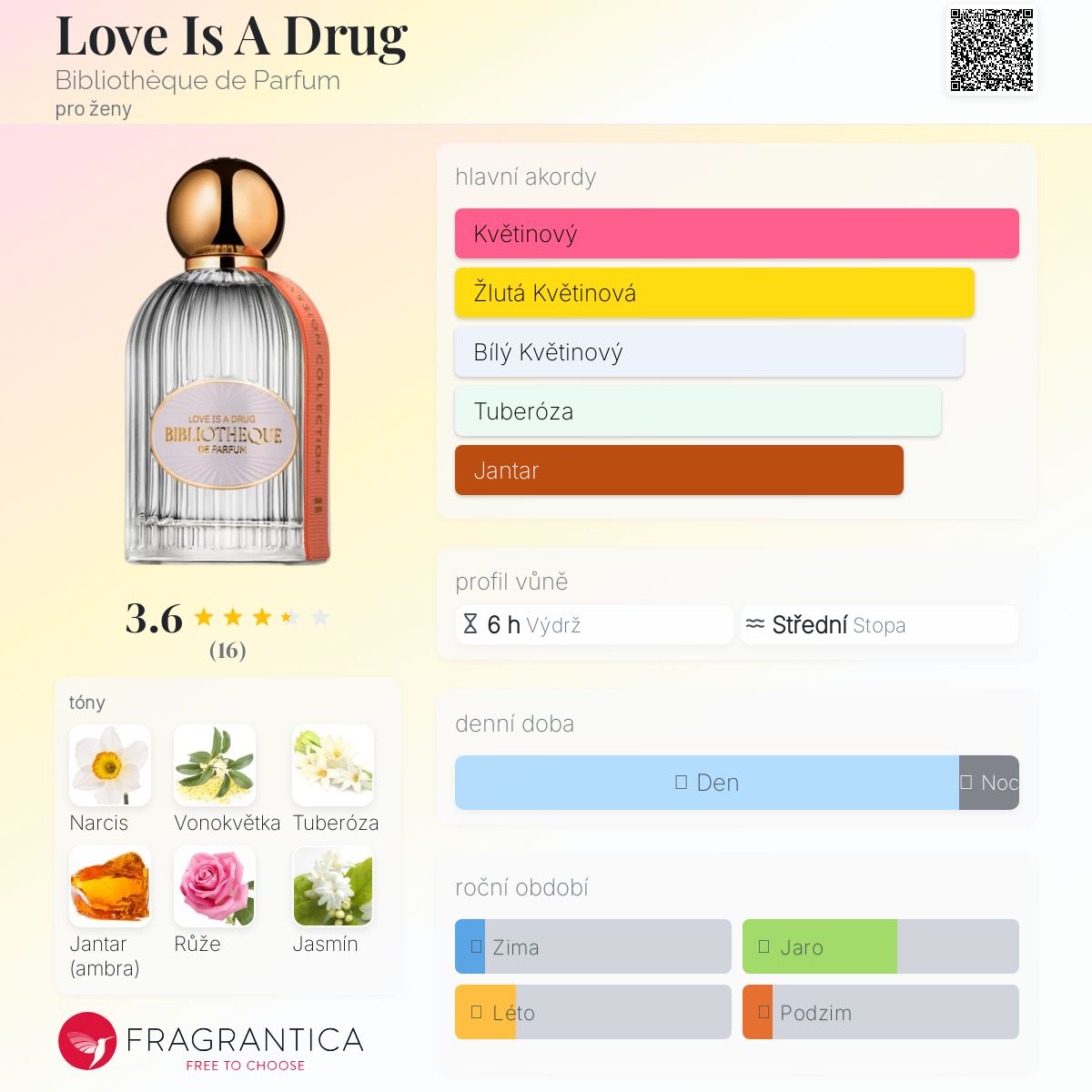 Love Is A Drug podle Bibliothèque de Parfum je Floral vůně pro ženy. Love Is A Drug byl/a uveden/a v roce 2019. Vrchní tóny jsou Vonokvětka, Růže de Mai a Jasmín; střední tóny jsouNarcis a Indická tuberóza ; základní tóny jsou Jantar (ambra) a Cedr.