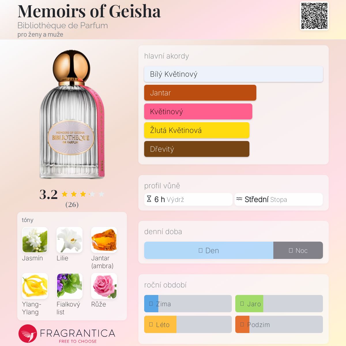 Memoirs of Geisha podle Bibliothèque de Parfum je Floral vůně pro ženy a muže. Memoirs of Geisha byl/a uveden/a v roce 2019. Vrchní tóny jsou Vodní jasmín, Ylang-Ylang, Bergamot a Tráva; střední tóny jsouLilie, Fialkové listy, Damašská růže, Broskev, Hruškový květ a Bílý heliotrop ; základní tóny jsou Jantar (ambra), Kašmírové dřevo, Kokos, Eben, Vanilka, Cukr a Fazole tonka.