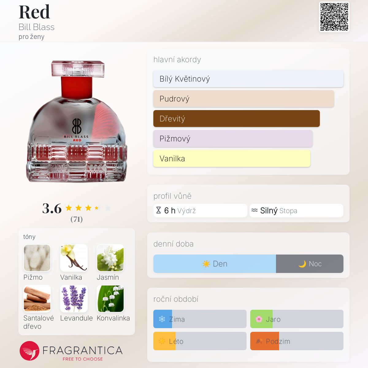 Red podle Bill Blass je Floral Woody Musk vůně pro ženy. Red byl/a uveden/a v roce 2009. Vrchní tóny jsou Konvalinka a Bergamot; střední tóny jsouJasmín, Santalové dřevo a Levandule ; základní tóny jsou Pižmo, Vanilka, Pačuli a Jantar (ambra).
