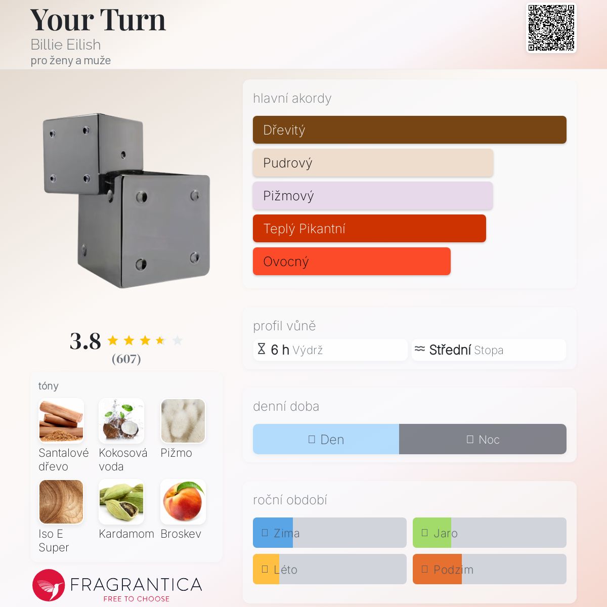 Your Turn podle Billie Eilish je Woody Floral Musk vůně pro ženy a muže. Toto je nová vůně. Your Turn byl/a uveden/a v roce 2025. Vrchní tóny jsou Kardamom, Zázvor a Bergamot; střední tóny jsouKokosová voda, Broskev a Noční kvetoucí jasmín ; základní tóny jsou Australské santalové dřevo, Pižmo a Iso E Super.