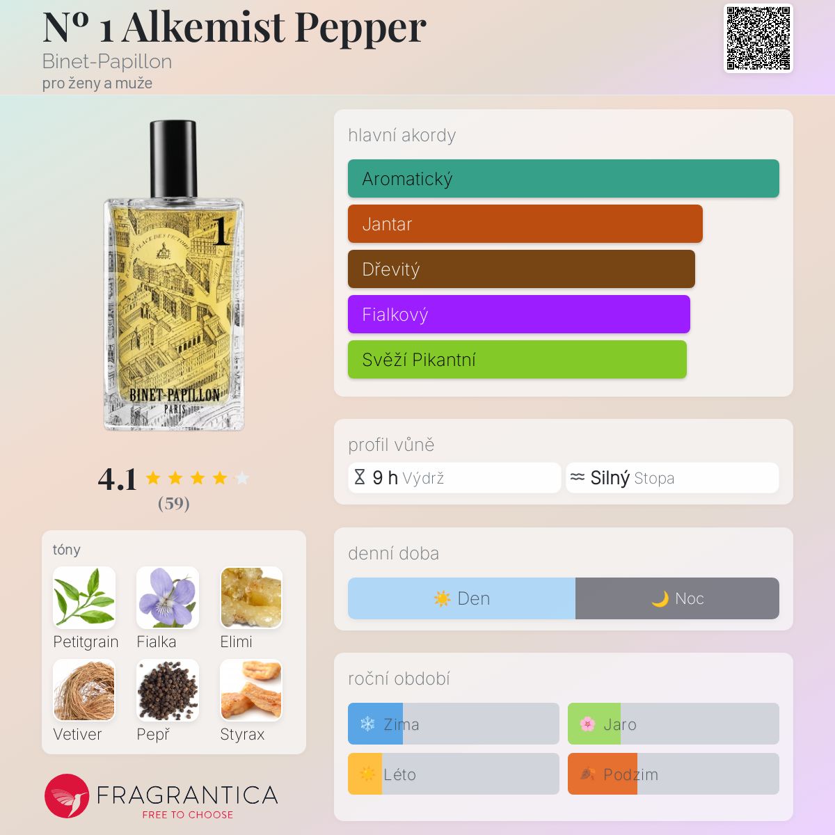 Nº 1 Alkemist Pepper podle Binet-Papillon je vůně pro ženy a muže. Nº 1 Alkemist Pepper byl/a uveden/a v roce 2017. "Nosem" za touto vůní je Jean Sauvage. Vrchní tóny jsou Petitgrain, Elemi a Pepř; střední tóny jsouFialka a Labdanum ; základní tóny jsou Vetiver a Styrax.