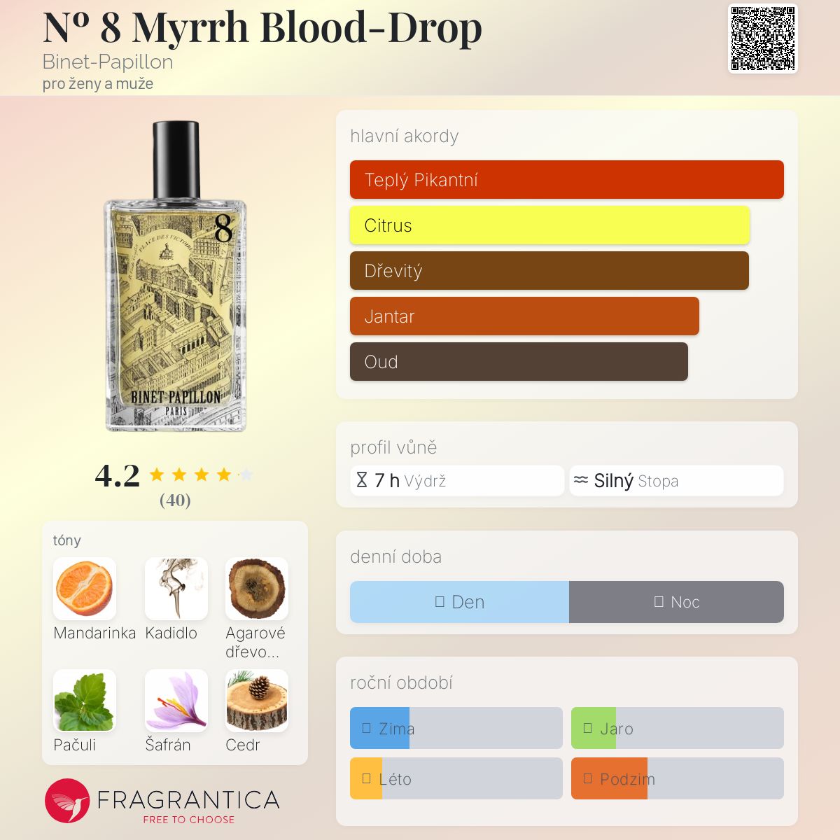 Nº 8 Myrrh Blood-Drop podle Binet-Papillon je Woody Spicy vůně pro ženy a muže. Nº 8 Myrrh Blood-Drop byl/a uveden/a v roce 2015. "Nosem" za touto vůní je Jean Sauvage. Vrchní tóny jsou Mandarinka a Šafrán; střední tóny jsouKadidlo a Cedr ; základní tóny jsou Agarové dřevo (oud) a Pačuli.