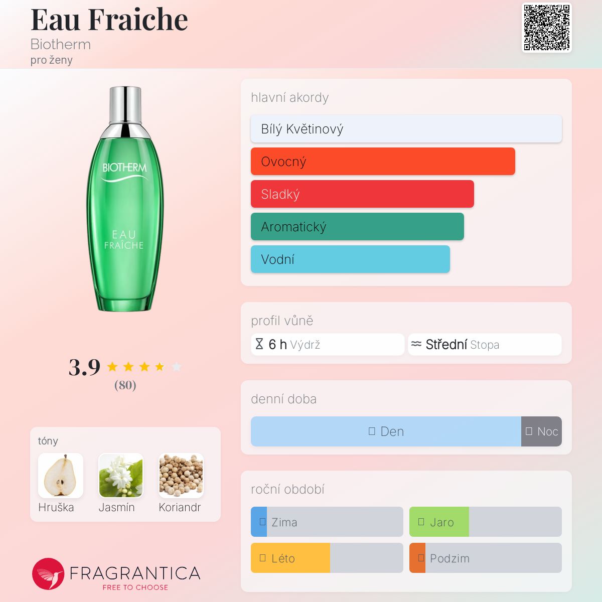 Eau Fraiche podle Biotherm je Floral Fruity vůně pro ženy. Eau Fraiche byl/a uveden/a v roce 2014. "Nosem" za touto vůní je Antoine Maisondieu.