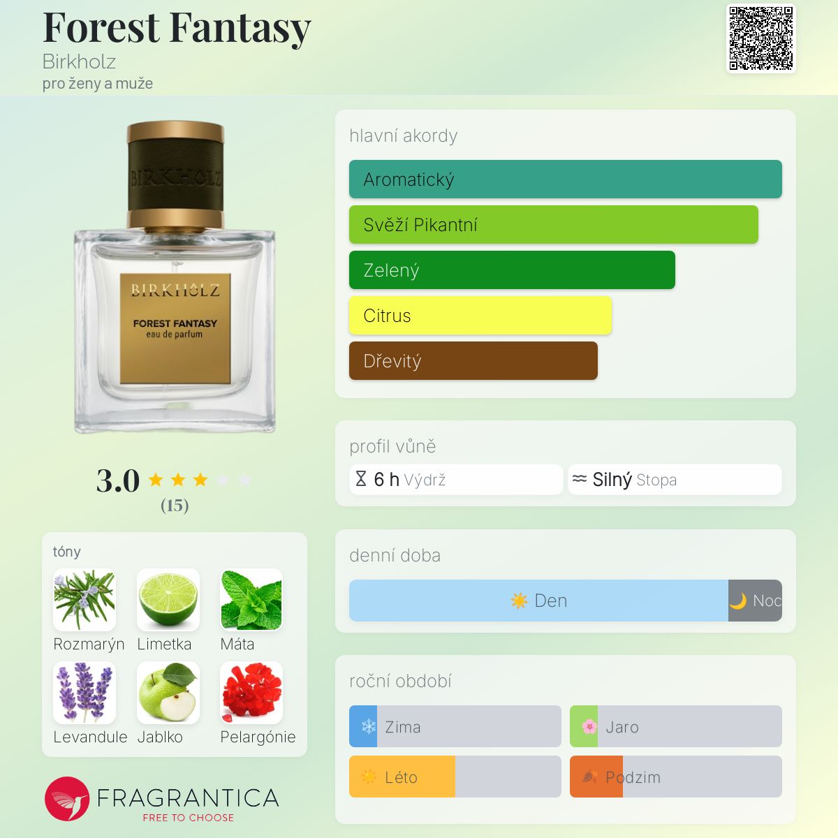 Forest Fantasy podle Birkholz je Woody Spicy vůně pro ženy a muže. Forest Fantasy byl/a uveden/a v roce 2017. Vrchní tóny jsou Rozmarýn, Limetka a Anýz; střední tóny jsouLevandule, Jablko, Pelargónie a Guajakové dřevo ; základní tóny jsou Máta, Limetka, Růžový pepř a Bergamot.