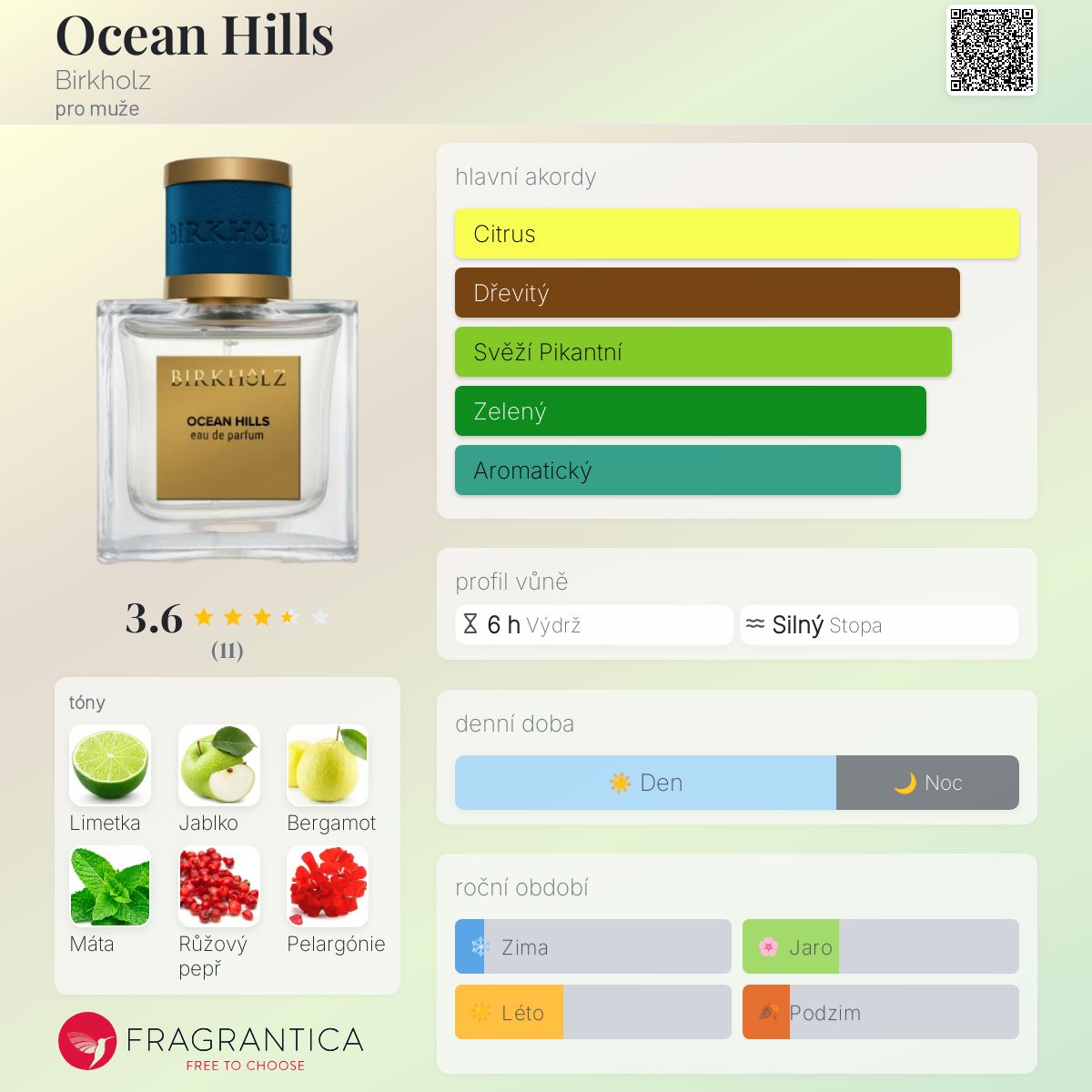 Ocean Hills podle Birkholz je Woody Chypre vůně pro muže. Ocean Hills byl/a uveden/a v roce 2017. Vrchní tóny jsou Limetka, Bergamot, Máta a Růžový pepř; střední tóny jsouJablko, Pelargónie, Levandule a Guajakové dřevo ; základní tóny jsou Cedr, Pačuli, Dubový mech a Kůže.