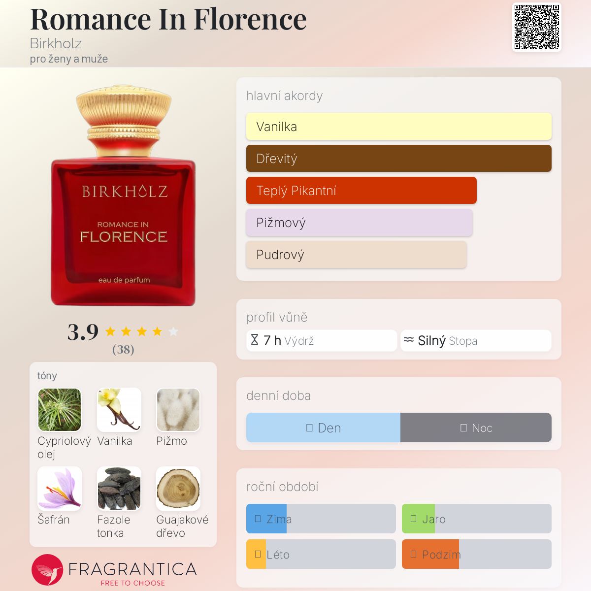 Romance In Florence podle Birkholz je vůně pro ženy a muže. Romance In Florence byl/a uveden/a v roce 2022. "Nosem" za touto vůní je Dominique Moellhausen. Vrchní tóny jsou Cypriolový olej a Bílé pižmo; střední tóny jsouVanilka, Šafrán a Kardamom ; základní tóny jsou Fazole tonka a Guajakové dřevo.