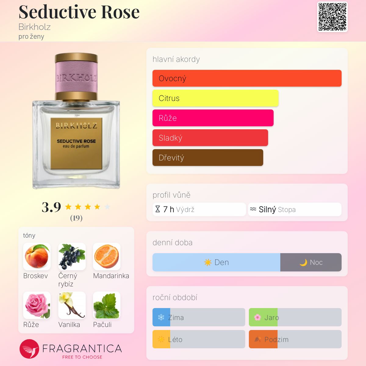 Seductive Rose podle Birkholz je Woody Chypre vůně pro ženy. Seductive Rose byl/a uveden/a v roce 2017. Vrchní tóny jsou Černý rybíz, Broskev a Mandarinka; střední tóny jsouRůže, Pomerančový květ a Frézie ; základní tóny jsou Vanilka, Pačuli a Pižmo.