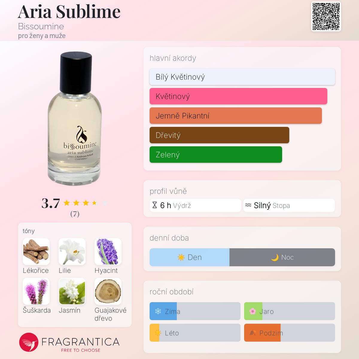 Aria Sublime podle Bissoumine je Floral Green vůně pro ženy a muže. Aria Sublime byl/a uveden/a v roce 2013. Vrchní tóny jsou Lékořice a Hyacint; střední tóny jsouBílá lilie, Jasmín a Tabákový list ; základní tóny jsou Šuškarda, Guajakové dřevo a Virginský cedr.