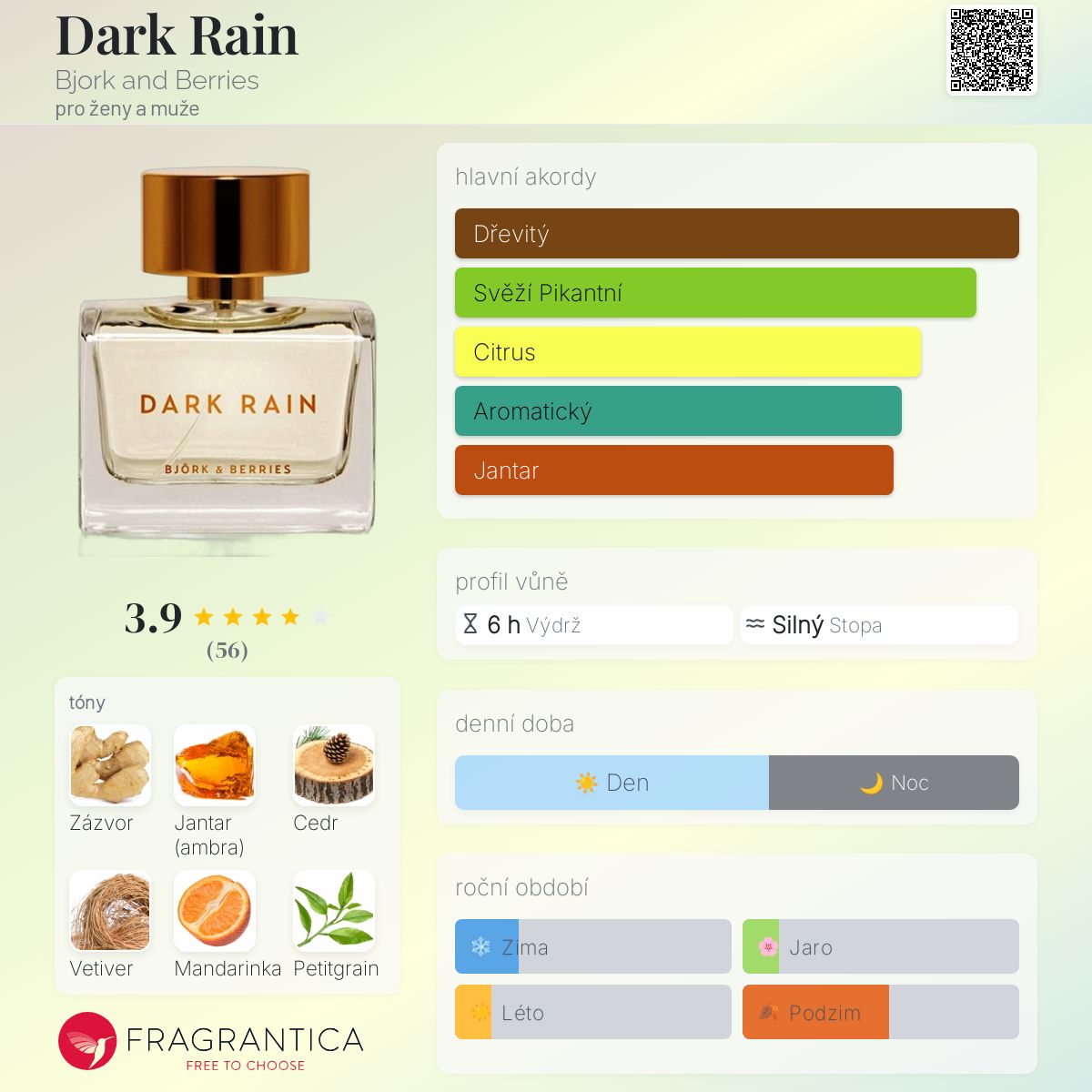 Dark Rain podle Bjork and Berries je Woody Chypre vůně pro ženy a muže. Dark Rain byl/a uveden/a v roce 2016. "Nosem" za touto vůní je Jérôme Epinette. Vrchní tóny jsou Zázvor a Mandarinka; střední tóny jsouPetitgrain, Pelargónie a Jasmín ; základní tóny jsou Jantar (ambra), Cedr a Vetiver.