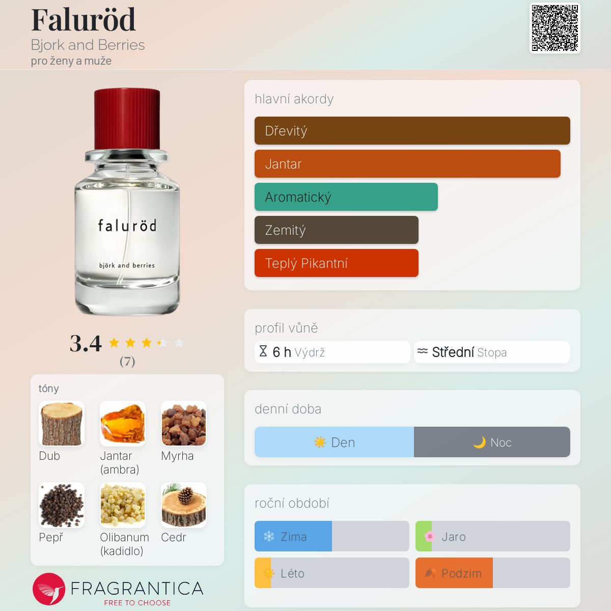 Faluröd podle Bjork and Berries je Woody Spicy vůně pro ženy a muže. Toto je nová vůně. Faluröd byl/a uveden/a v roce 2025. Vrchní tón je Černý pepř ; střední tóny jsouDub a Kadidlo ; základní tóny jsou Jantar (ambra), Myrha a Cedr.